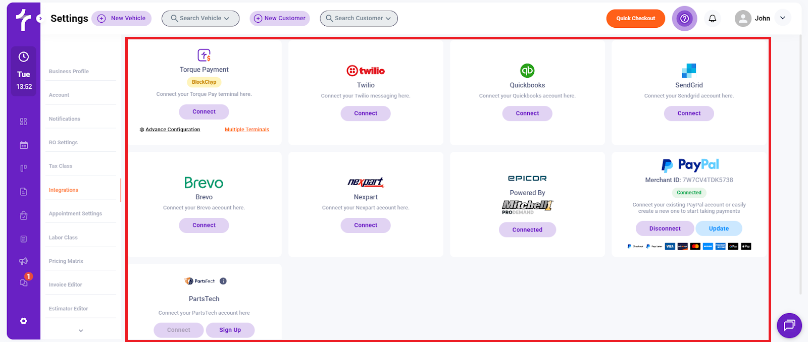 Torque360 integrates with third-party tools to handle payments, accounting, messaging, email delivery, and parts sourcing. From this screen, you can connect, update, or disconnect integrations based on your shop’s needs.