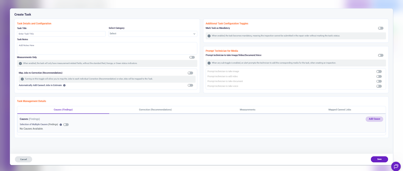 Inspection tasks define the specific checks technicians perform within each inspection group. The Advanced Template follows a Triple-C structure (Concern, Cause, Correction) to help technicians document issues clearly and recommend the appropriate repairs.
