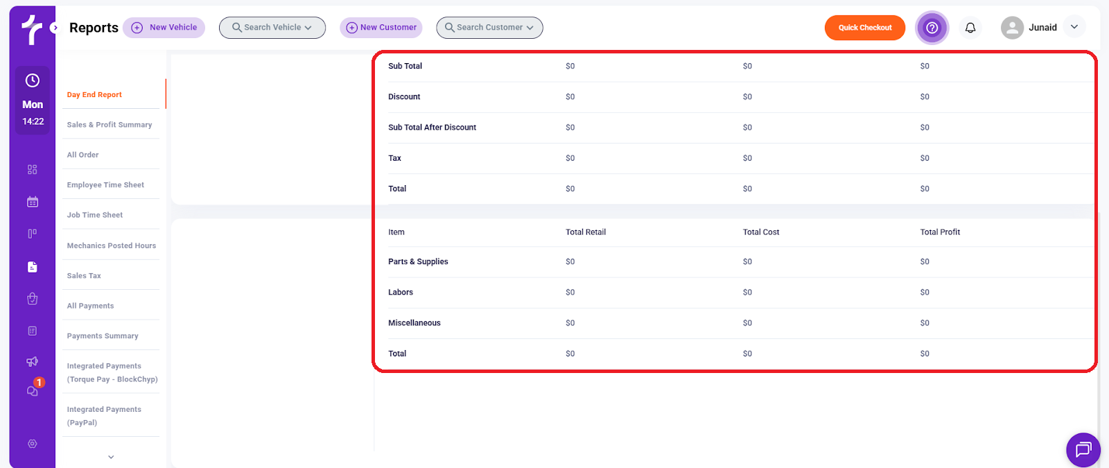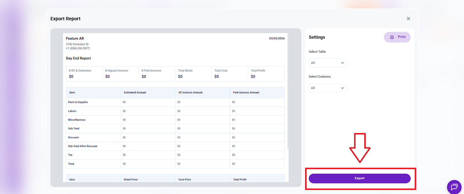 The Day End Report provides a consolidated financial summary of your shop’s daily activity. It combines repair order activity, invoice status, revenue, cost, and profit into a single view so you can quickly evaluate daily performance before closing operations.