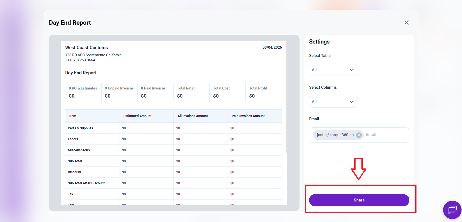 Click the Share button to send the report directly via email.