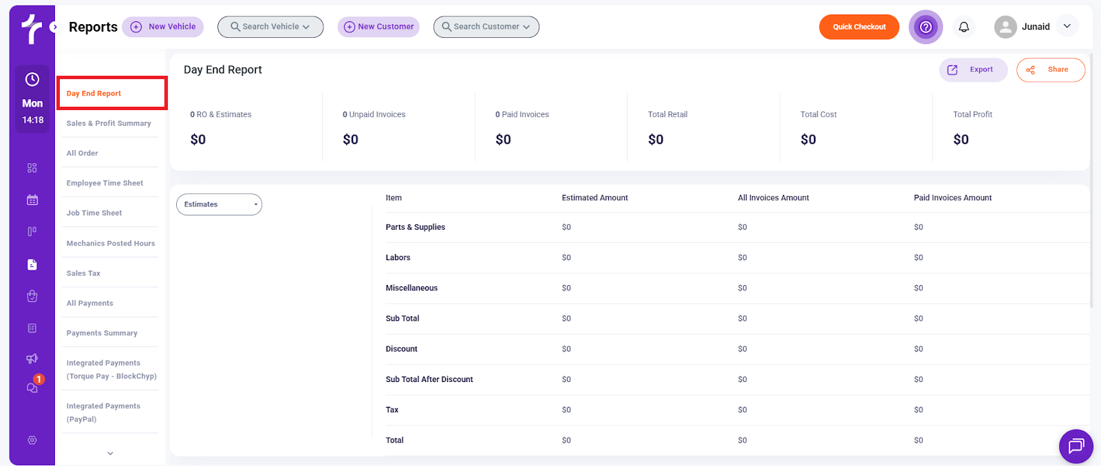 The Day End Report helps shop owners and managers review daily sales, invoice status, revenue, costs, and profit to confirm financial activity before closing the business day.