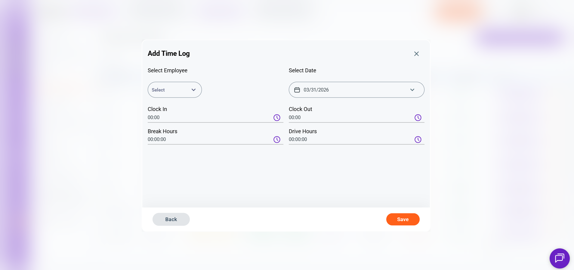 Click Add Clock In/Clock Out Record in the top-right corner. The Add Time Log panel will open.