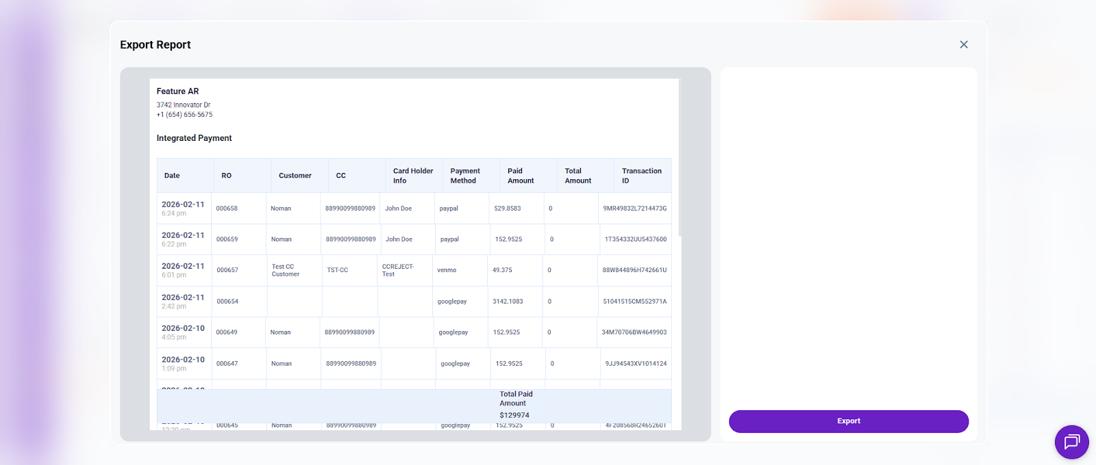 This opens the Export Report window, where you can preview the report before downloading it. The export includes transaction details such as: