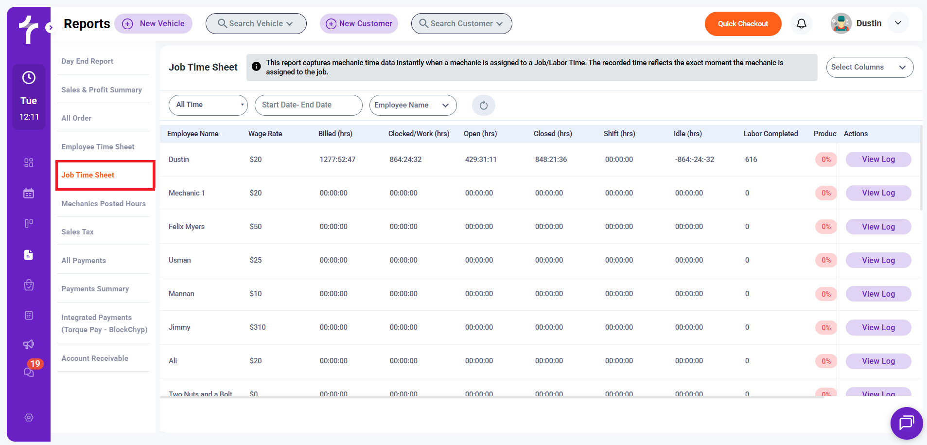 The Job Time Sheet report tracks mechanic time automatically when a mechanic is assigned to a job or labor task. The recorded time reflects the exact moment the assignment occurs, allowing you to measure technician productivity and job efficiency.