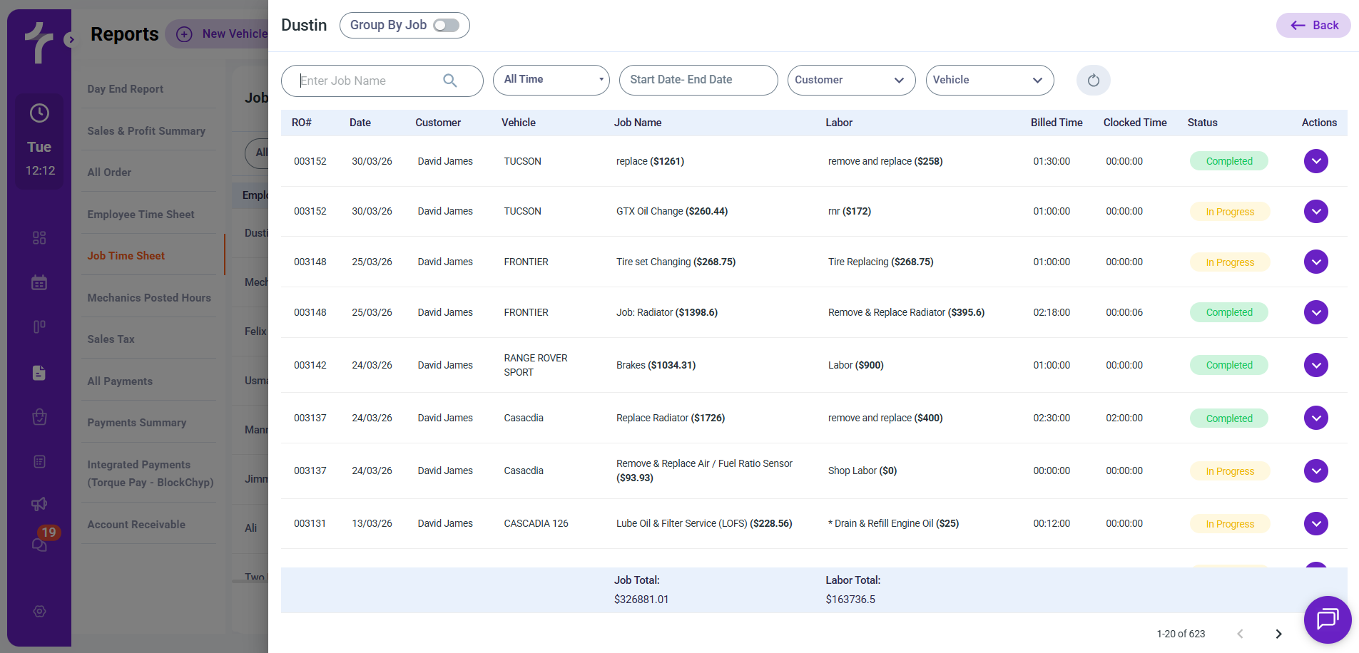 Use the filters to search by job, select a specific date range, or filter by customer name or vehicle.