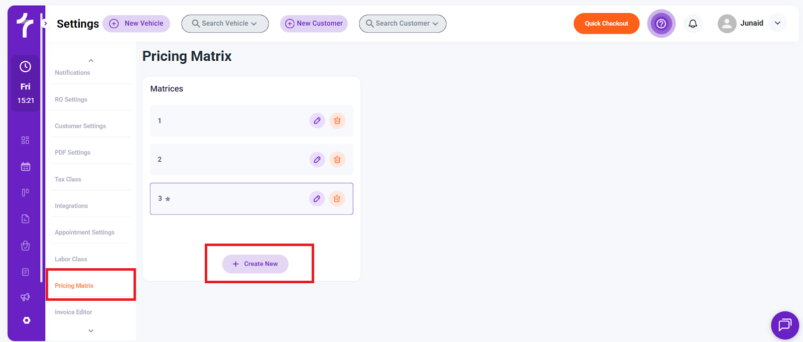 When you first open the Pricing Matrix section, you’ll see an empty state with a Create New button. Any matrices you create will appear here and can be managed, edited, or deleted later.