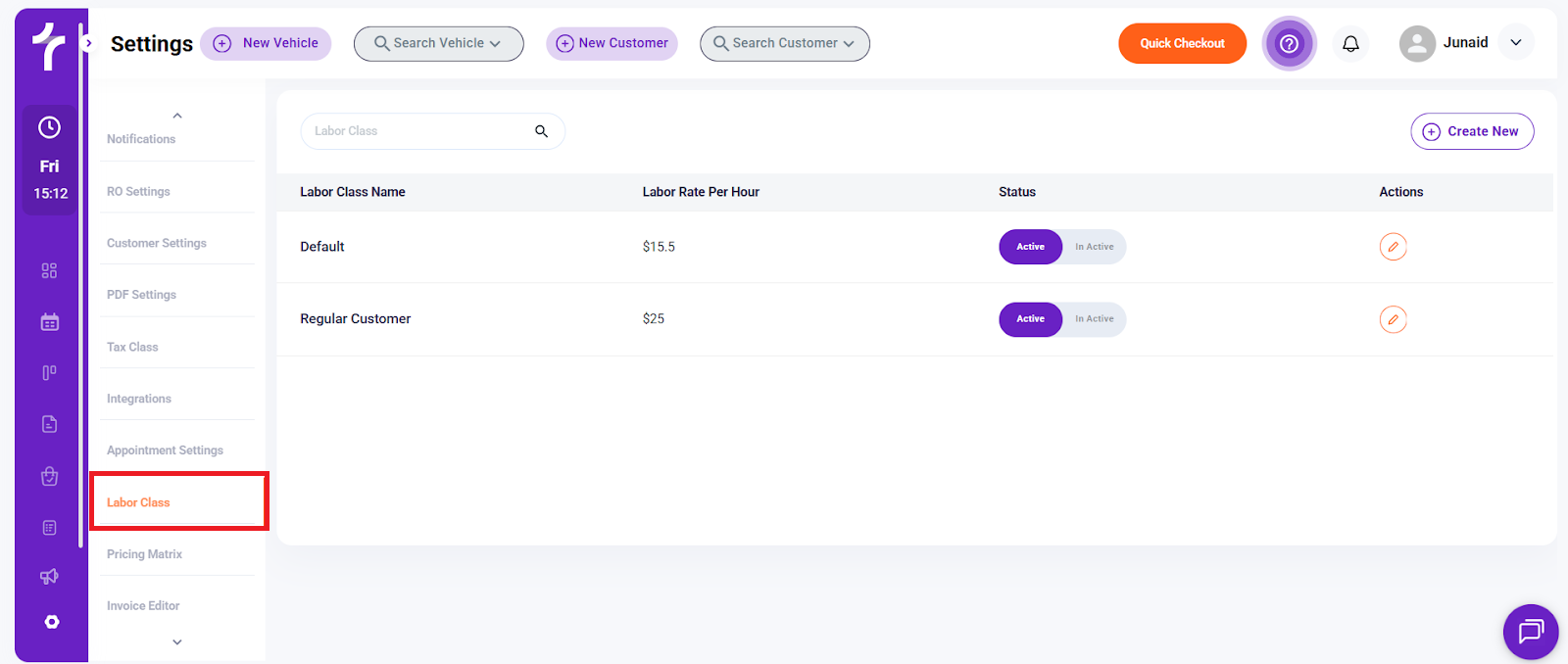 Labor Classes allow you to define different labor rates for your shop. These rates are applied when creating estimates, repair orders, and invoices, ensuring accurate and consistent labor pricing.