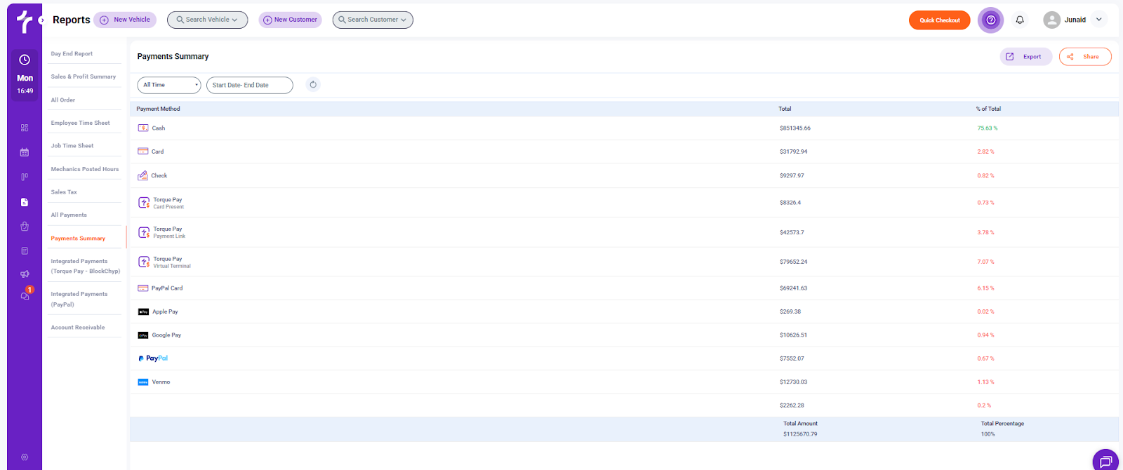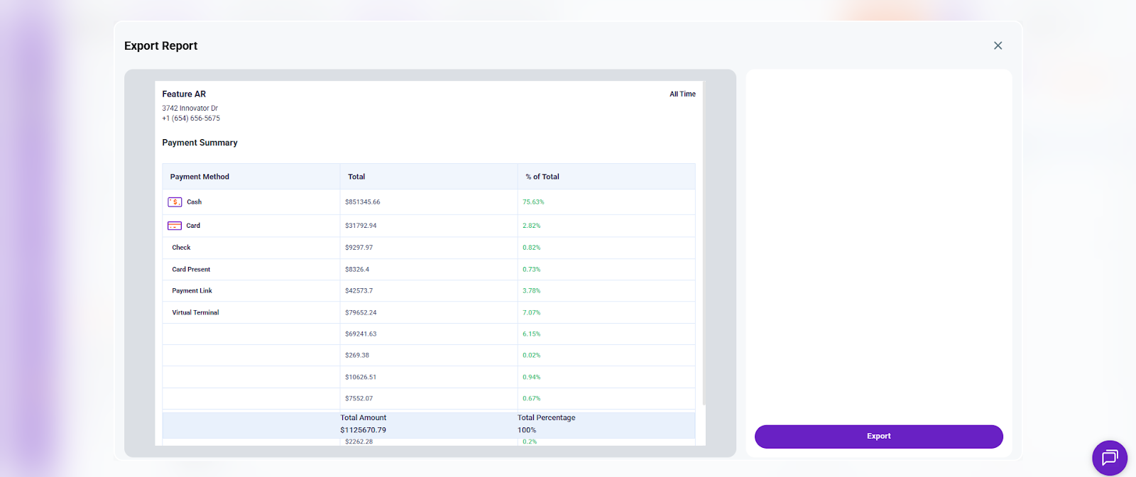 The Payments Summary report provides a consolidated breakdown of total payments collected by payment method within a selected time period. It helps you understand how customers are paying and what percentage each payment method contributes to the total collected revenue.