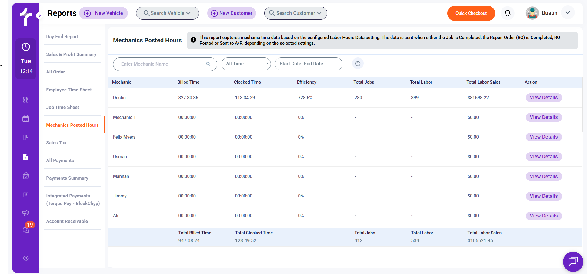 The Mechanics Posted Hours report provides a performance overview of each mechanic by comparing billed time with clocked time. It helps shop owners and managers evaluate technician efficiency, job volume, and total labor sales within a selected time range.