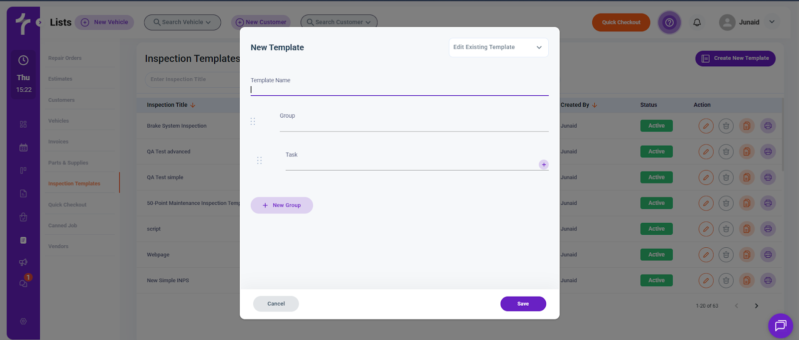 A Simple Inspection Template allows shops to create structured digital inspection checklists for technicians. Using groups and tasks, shops can organize inspection points into clear sections such as brakes, tires, engine, or fluids.