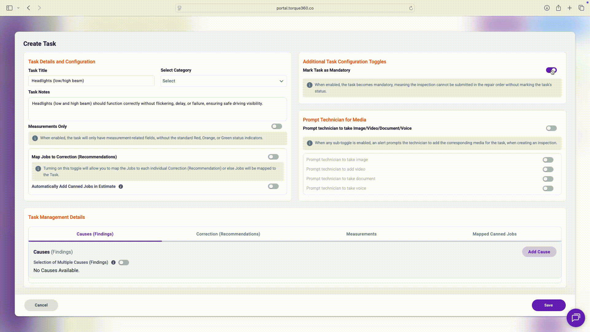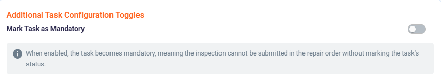 When enabled, the task becomes mandatory, meaning the inspection cannot be submitted in the repair order without marking the task's status.