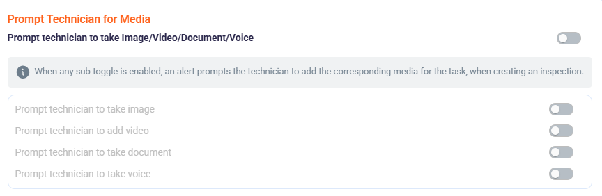 Prompt technician to take Image/Video/Document/Voice. When any sub-toggle is enabled, an alert prompts the technician to add the corresponding media for the task when creating an inspection.