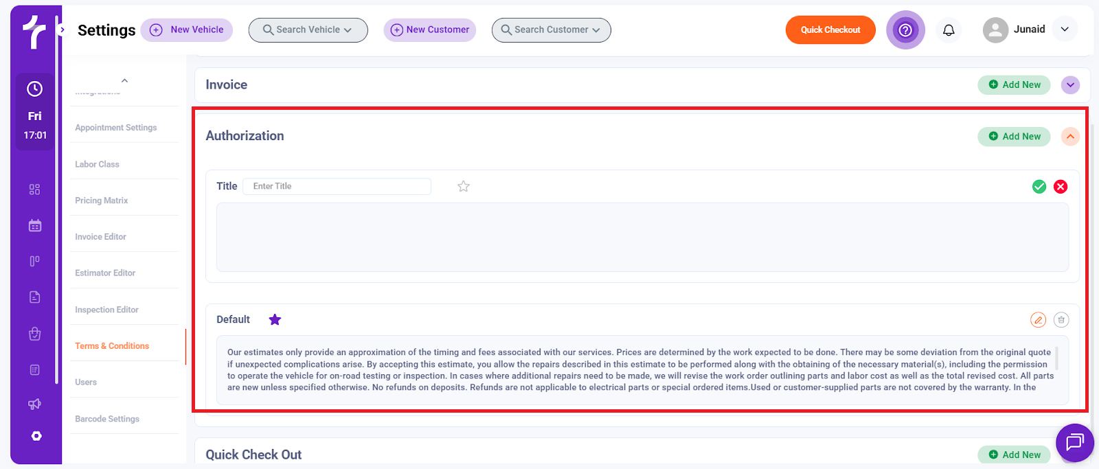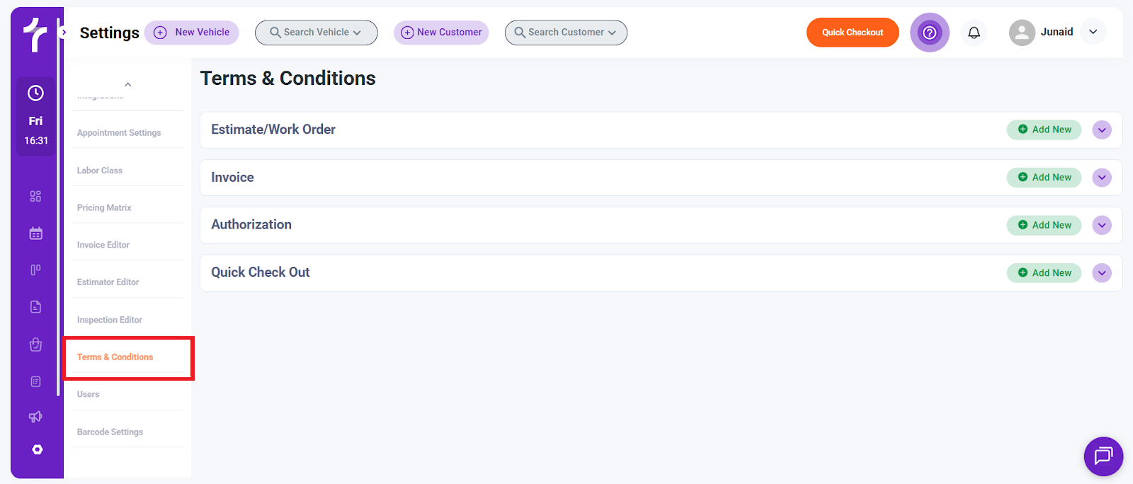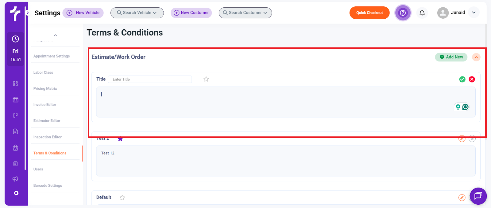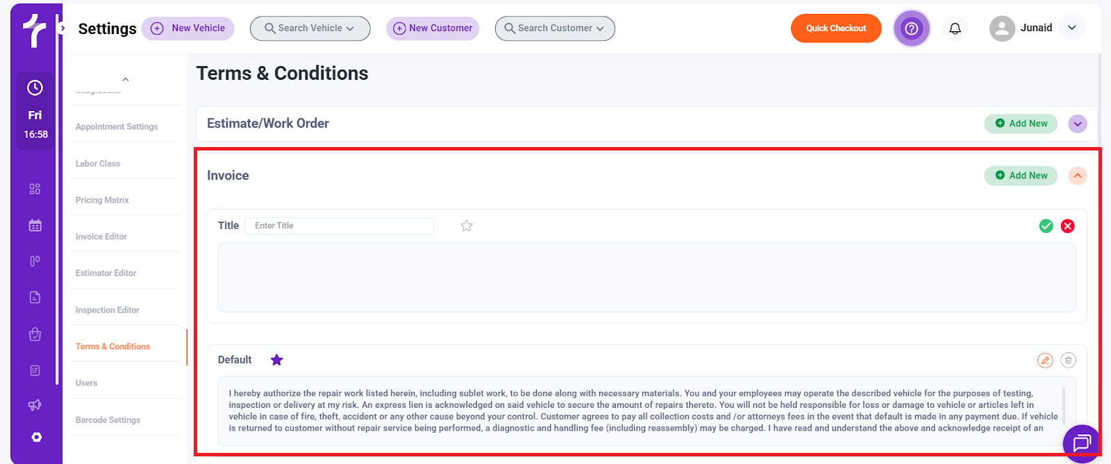 The Terms & Conditions section allows you to create, manage, and customize legal and authorization text that appears across different customer-facing documents and workflows in Torque360. These terms help set expectations, protect your business, and ensure customers acknowledge important policies.